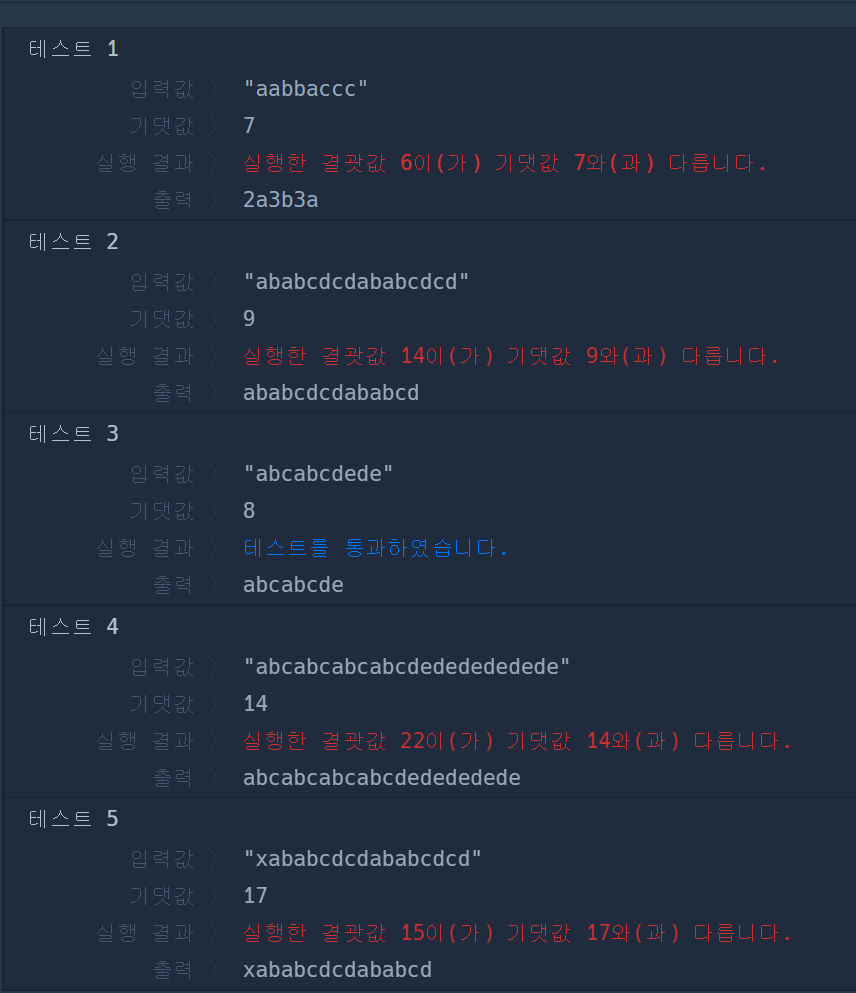 다른 예로, "abcabcdede"와 같은 경우, 문자를 2개 단위로 잘라서 압축하면 "abcabc2de"가 되지만, 3개 단위로 자른다면 "2abcdede"가 되어 3개 단위가 가장 짧은 압축 방법이 됩니다. 이때 3개 단위로 자르고 마지막에 남는 문자열은 그대로 붙여주면 됩니다.