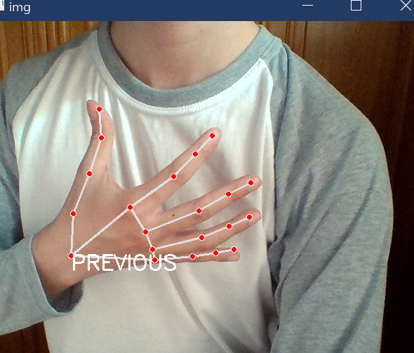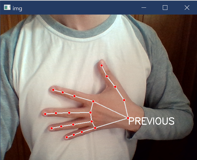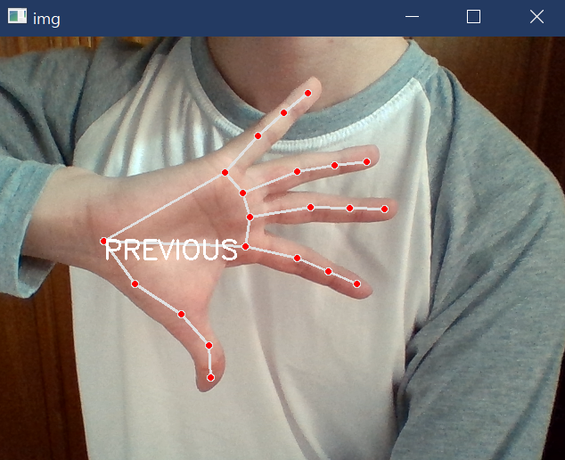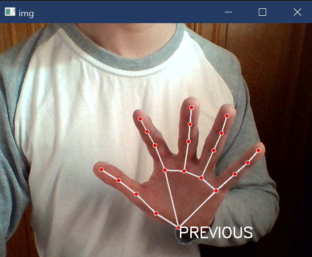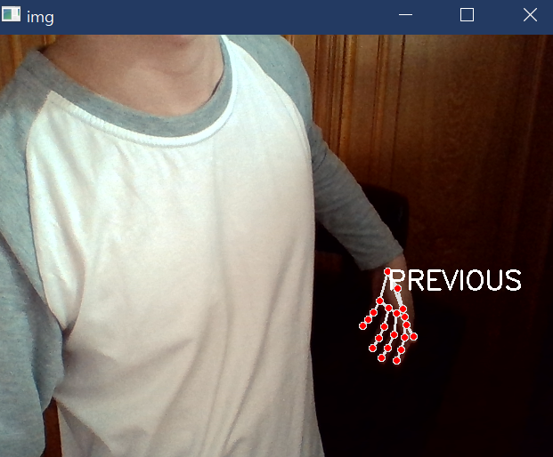'previous'는 손을 쥐었다 피는 동작이고, 'next'는 엄지를 어깨넘어로 가르키는 동작이다.