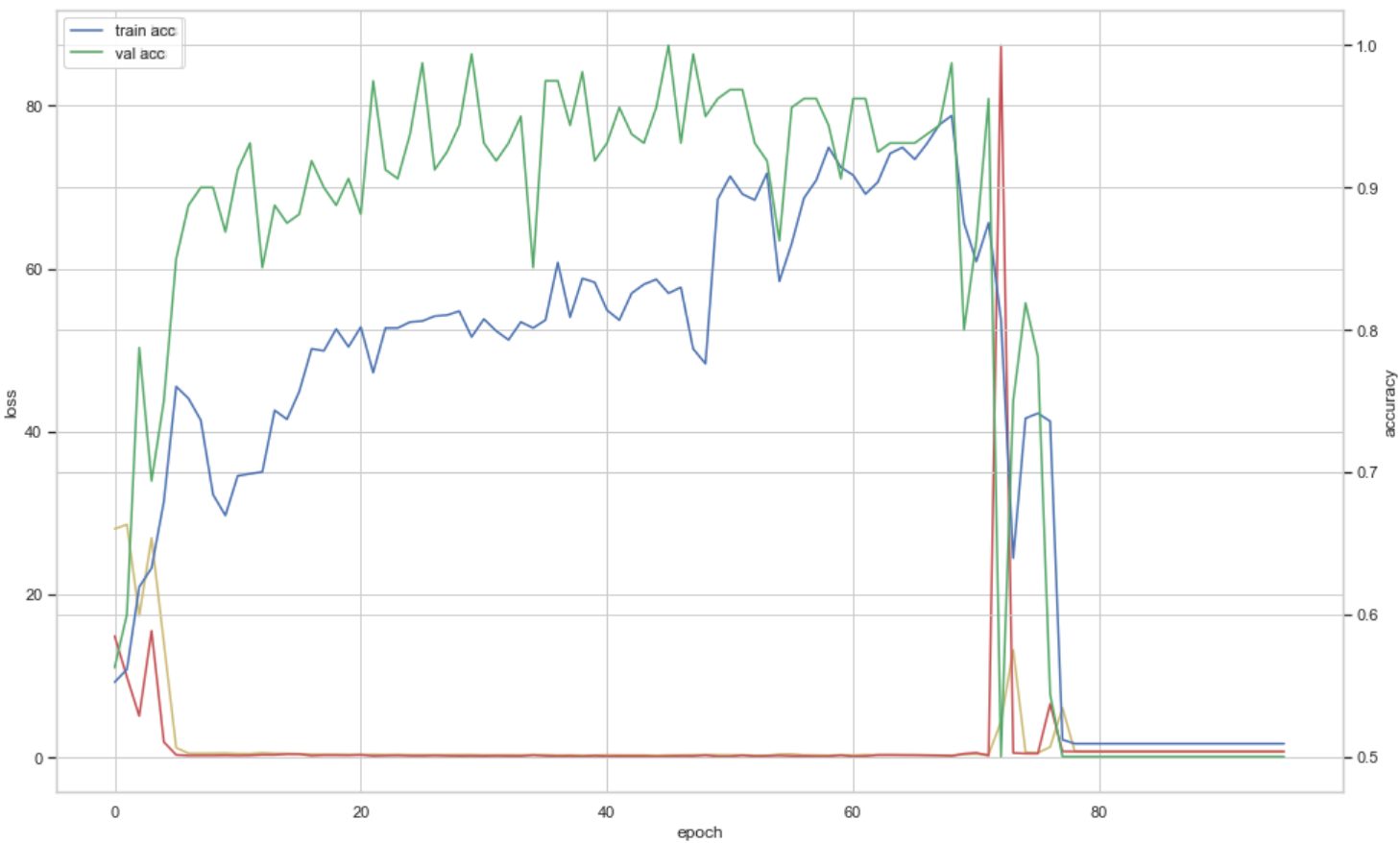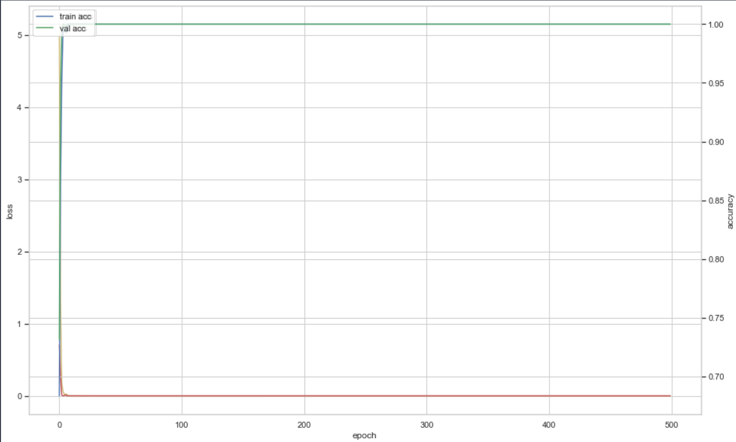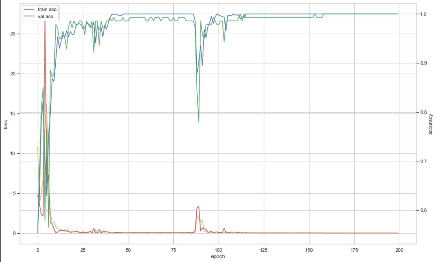 하나의 dataset으로 훈련해서 과적합이 강하게 의심된다. 110번부터 validation loss는 거의 0으로 수렴하고, validation accuracy는 1에 도달한다.