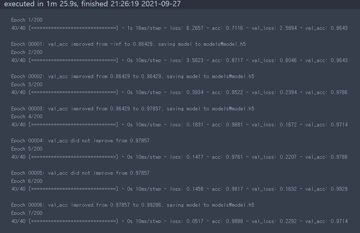 간단한 모델이니 만큼 cousion matrix는 all perfect이다. model의 학습결과는 epoch 115 때, val_loss: 0.0061 - val_acc: 1.0000으로 안정된 모습을 보인다.