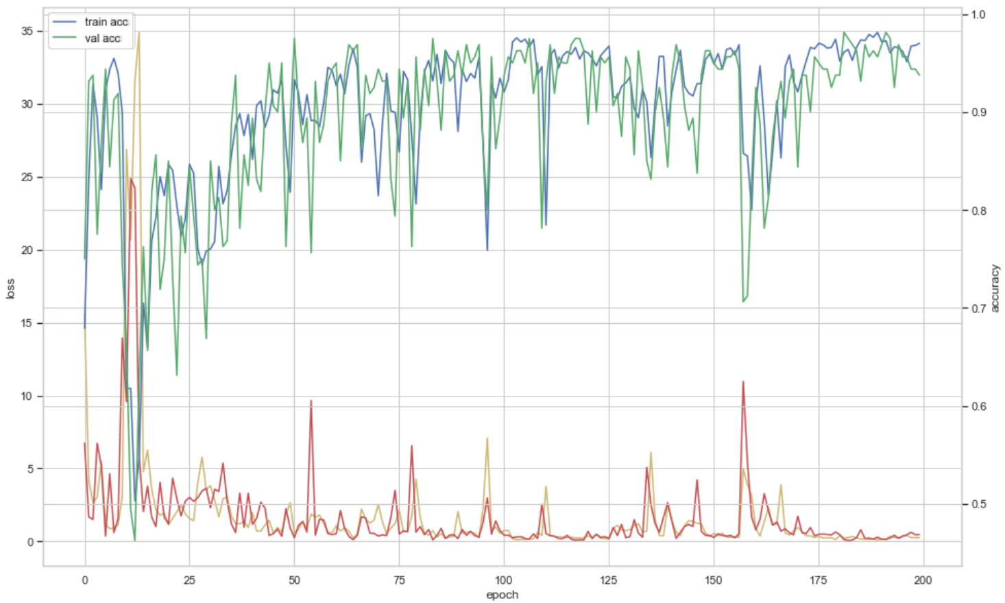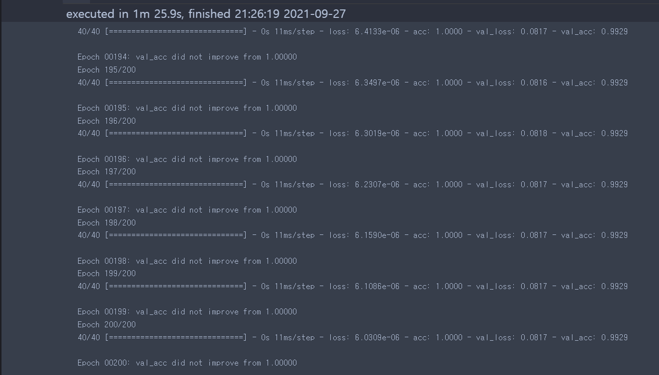 20회도 안되는 사이에 validation accuracy가 1에 도달했고, validation loss도 100회가 넘어가는 순간부터 0에 거의 근접하였다. callback 시에 ReduceLROnPlateau()과 ModelCheckpoint()를 호출하였다. 다만, ReduceLROnPlateau()의 patience를 50으로 설정했기 때문에 early stop 없이 200 epoch 동안 학습을 수행하였다.
