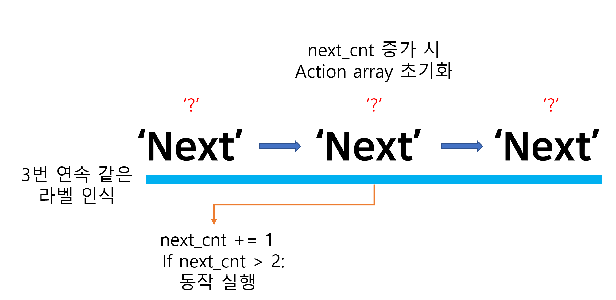 그런데 한번 인식되면 'next' 'next' 'next' 실행 된 이후에도 array로 저장된 label들이 다음 동작 인식에 영향을 미쳤다. 로봇의 경우 input이 로봇이 원하는 위치에 도달할 때까지 지속되므로 일종의 관성(모멘텀)을 받도록 설계되었다.