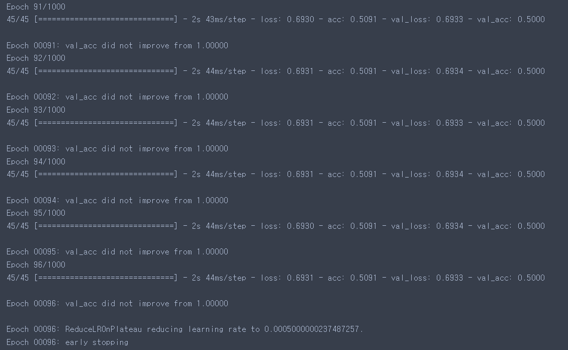 val_loss와 val_acc, loss와 acc 모두 79번째 epoch를 기점으로 변화를 멈췄다.