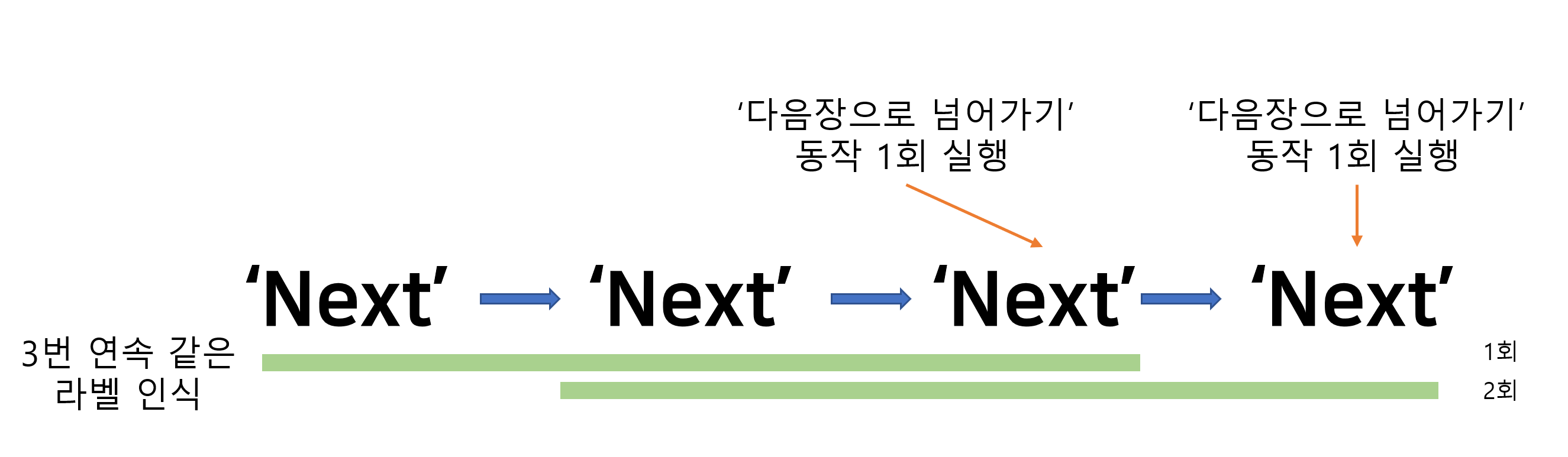 3번 동안 같은 라벨로 인식되었을 때 다음 장 혹은 이전 장으로 넘어가도록 설정했다.